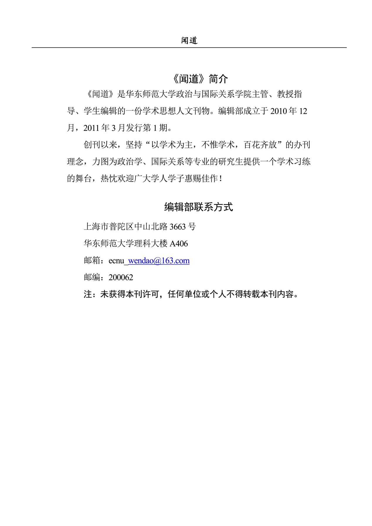 《闻道》是h动漫 主管、教授指导、学生编辑的一份学术思想人文刊物。编辑部成立于2010年12月,2011年3月发行第1期。创刊以来,坚持“以学术为主,不惟学术,百花齐放”的办刊理念,力图为政治学、国际关系等专业的研究生提供一个学术习练的舞台,热忱欢迎广大学人学子惠赐佳作!