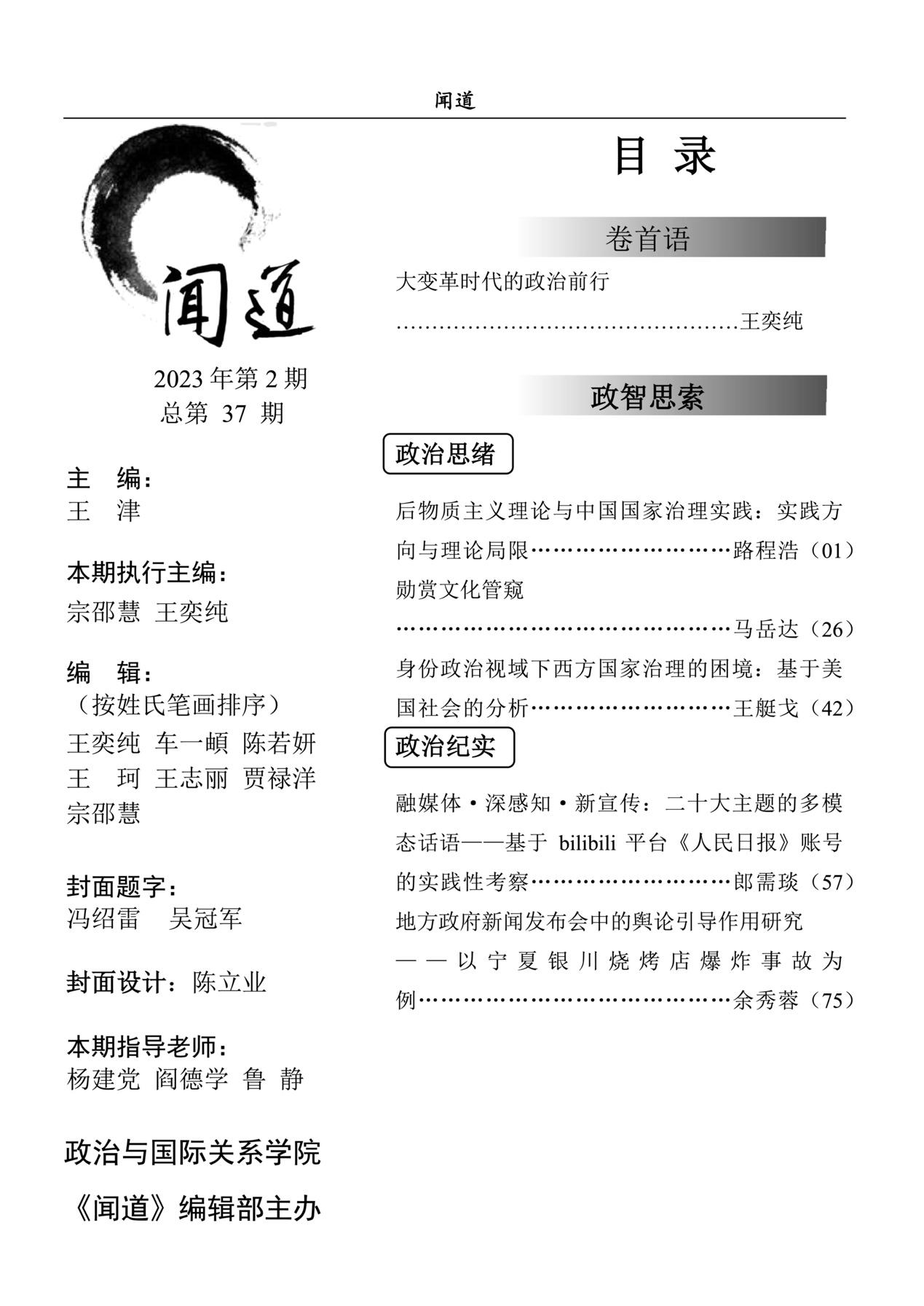 王奕纯同学在卷首语中讨论了新技术时代人类社会面临的挑战和政治思考。本期三个栏目细分了六个板块进行研讨。政智思索板块讨论了国家治理实践理论和国内外热点问题;学研思考板块探讨了学术研究伦理与人工智能背景对研究的影响;百花齐放板块收录的随笔,分享了政院学子在海外精彩的访学生活。