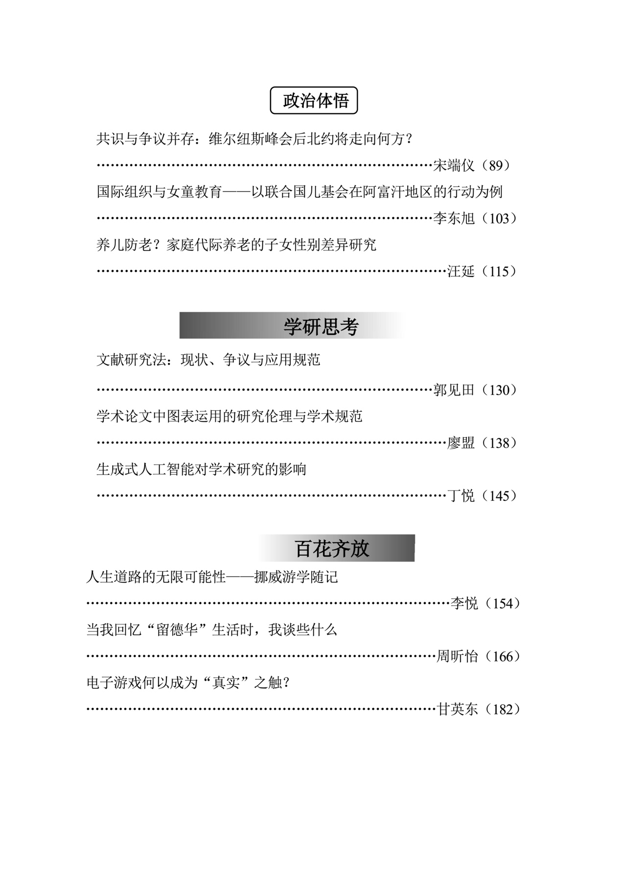 在政智思索板块,展现了对国际治理理论、国际形势、国内外特点事件的思考,尤其聚焦政治思想与政治传播的现实反思。路程浩同学分析了后物质主义理论在我国国家治理实践中的影响和理论局限。马岳达同学关注勋赏文化,从中窥见不同类型政治文化中展现出的多样符号特征与规则体系。王艇戈同学从身份政治的视角分析美国社会出现认知危机和社会秩序混乱的原因。郎需琰同学基于bilibili平台《人民日报》账号发布的视频,分析党的二十大宣传中的多模态话语。余秀蓉同学根据宁夏银川烧烤店爆炸事故中地方政府新闻发布会的表现,研究政府如何发挥舆论引导作用。宋端仪同学从维尔纽斯峰会公报入手,关注北约战略决策动向,探寻北约成员国对于当前和未来安全挑战的关切和立场。李东旭同学以联合国儿基会在阿富汗地区的行动为例,聚焦国际组织对女童的教育工作。汪延同学基于2018年中国家庭追踪调查数据,分析家庭代际养老支持中存在的性别差异。