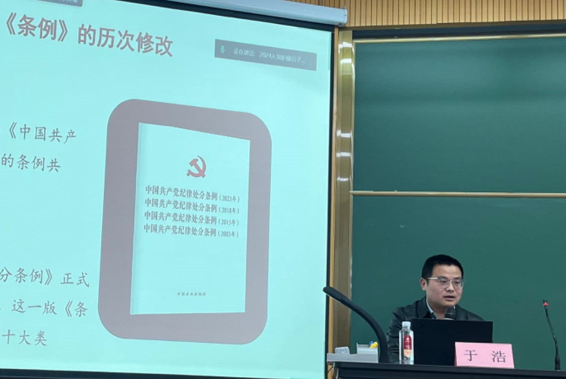 张老师与我们分享了他最近的研究成果,通过对上海党组织早期发展历史的学习,我们认识到了当时上海党组织领导工人运动、组织党内外工作必须要将理论经验和具体实践相结合,这些对我们来说非常具有启示意义。我作为入党积极分子,在深入学习理论的同时,也要积极参加实践,把自己的专业学习和实践充分结合。于老师通过详细的讲解和生动的案例解读了《中国共产党纪律处分条例》,使我们了解到在新时代党的建设背景下,深刻落实全面从严治党的重要意义。近期全党将要开展党纪学习教育工作,作为入党积极分子的我们,更是要认真学习并深刻认识党组织纪律的严明,遵守党的纪律,以高标准严要求向党组织看齐。