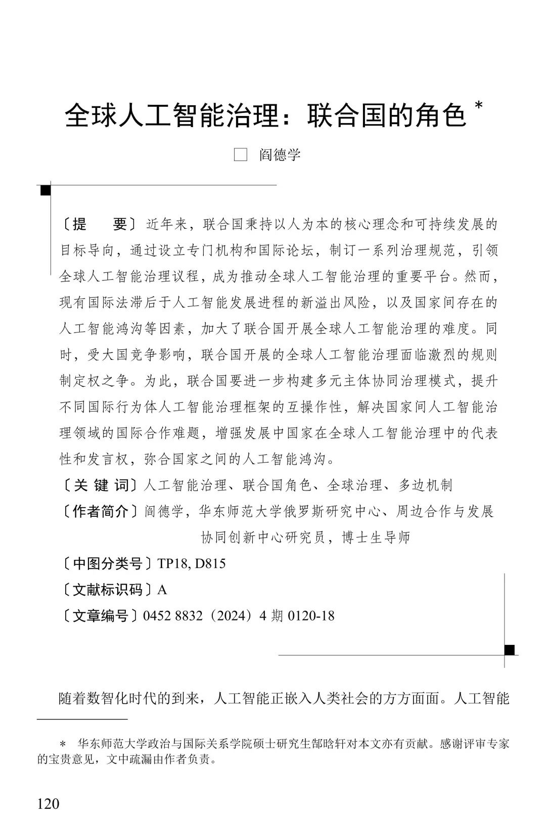 学术发表|阎德学:全球人工智能治理:联合国的角色