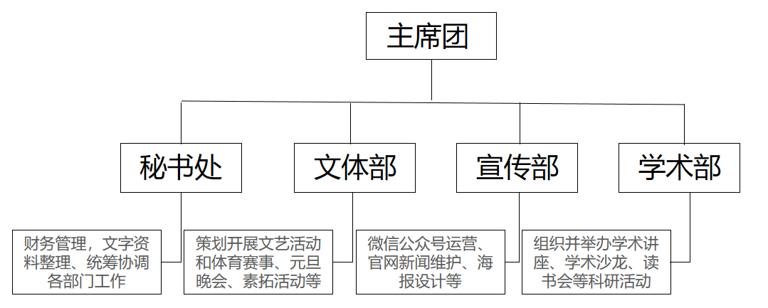 h动漫 研究生会是在学院党委领导、团委指导下的研究生骨干组织,始终秉承“上下贯通、协调有序、运转高效”的原则,以“主席团+四职能部门”为组织架构,致力于服务同学、促进学术、丰富文化、助力成长。我们不仅是学院与学生之间的桥梁,更是每一位研究生绽放才华、实现理想的重要平台。研究生会主席团目前设成员三人,四个职能部门分别为秘书处、文体部、宣传部和学术部。