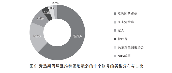第二,特朗普的框架反映了反建制派的立场,即使在建制派的共和党精英中的扩散仍然相当有限,难以形成一致的话语框架。与拜登不同,在特朗普前十个互动最多的推特账号中,共和党成员的占比并不高,只有10.4%(参见图3)。但是,特朗普倾向于转发保守派媒体,如布赖特巴特网站或者保守派媒体节目主持人的推特的内容来强化自己的观点和话语框架。另一方面,只要有媒体对疫情防控做正面报道时,他便立即回应,从而再次把话题置于他的“防疫成就”的框架中。