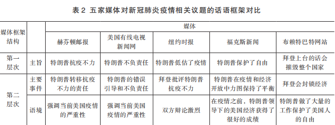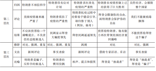 在政治竞选的过程中,候选人的政治话语不可避免地成为传统媒体与社交媒体的的主要消息来源。然而,作为“把关人”的传统媒体工作者们,总是会根据自己所认定的读者需求以及所在媒体组织提供的工作规范,对消息来源进行筛选、增减、包装或综合。媒体话语框架并不会被直接说出,而总是被隐藏在新闻的标题、导语、主要新闻事件的描述以及新闻评论等话语中。对新冠疫情报道中传统媒体话语框架结构的分析表明,不同立场的媒体之间截然不同的框架选择(详见表2)。然而在社交媒体竞选的时代,支持民主党与共和党传统媒体之间的框架的竞争逐渐让位于传统媒体框架与社交媒体框架的竞争,从而打破了传统媒体框架在总统竞选中的主导地位。