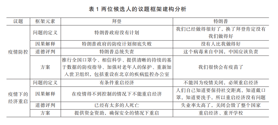 在总统竞选过程中,在野党候选人将在任总统的经济业绩与治理业绩作为参照系,在发起冲突性与攻击性框架上更具有优势。在任总统连任竞选的竞争力主要来自对政治资源的把控与较好的政治与经济业绩。而特朗普这方面表现的不足成为他连任失败的一大重要原因,这也说明框架的影响力与说服力并非只是语言游戏,而是还来自客观事实的支持。但由于总统竞选本身就是一场你赢我输的零和游戏,其固有的对垒性质也决定了总统候选人框架建构必然具有竞争性,极易呈现出一种二元对立的模式。