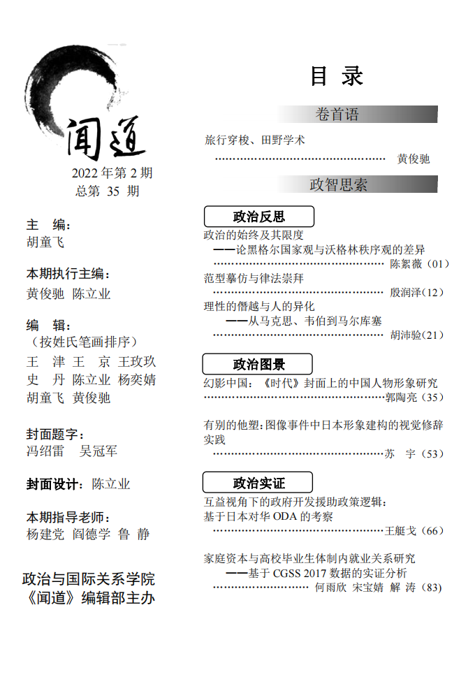 在政智思索板块,我们展现了多种对于共同体的灵魂与秩序的尝试与探索,尤其是以一种比较和他者的视角。在承认性与模仿性的政治秩序比较中,我们看到了基于不同起点的政治的终端(陈絮薇同学的论文);而利用恐惧来弥合律法崇拜与范型摹仿的张力却似乎奠定了“合众为一”的现代政治同质性(殷润泽同学的论文);当我们还未从这种古典式沉思或者早期现代的建构中缓过神来,现代及其祛魅已迫使我们转向批判和解构我们所崇尚的理性和理性所外化的秩序(胡沛验同学的论文)。在实证研究方面,《时代》上的幻象中国(郭陶亮同学的论文)和东京奥运会中的日本形象(苏宇同学的论文)从多模态隐转喻和视觉修辞的角度分别展现了共同体对于他者的错位想象,日本对华ODA考察(王艇戈同学的论文)、家庭资本与高校毕业生研究(何雨欣、宋宝婧、解涛同学的论文)则是在共同体的现实运作中选择小切口,分别论述了政府开发援助的政策逻辑、家庭资本影响就业的经济-社会-文化维度。