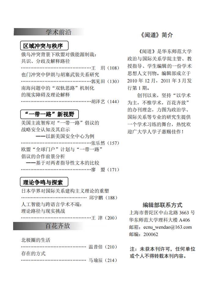在学术前沿板块,我们展现了对共同体之间的跨际联系与相互往来的多项研究。第一,地区冲突与秩序加速演化成为研究的焦点。王玥同学的论文探讨了俄乌冲突背景下欧盟对俄能源制裁,郭见田同学的论文阐释了也门冲突中伊朗与胡塞的武装关系,胡泽艺同学的论文解析了南海问题中的“双轨思路”机制化。第二,西方两大政治体对“一带一路”倡议的回应。廖盟同学的论文分析了欧盟“全球门户”计划与“一带一路”倡议的合作前景,张乐然同学的论文指出美国主流智库对“一带一路”倡议在地缘政治、商业贸易、国家治理与发展建构的战略安全认知。第三,理论探索。邱宇鹏同学的论文梳理了日本学界对国际关系理论的重塑,王津同学的论文探讨了通过人工智能应对跨语言学术不端的可能性。